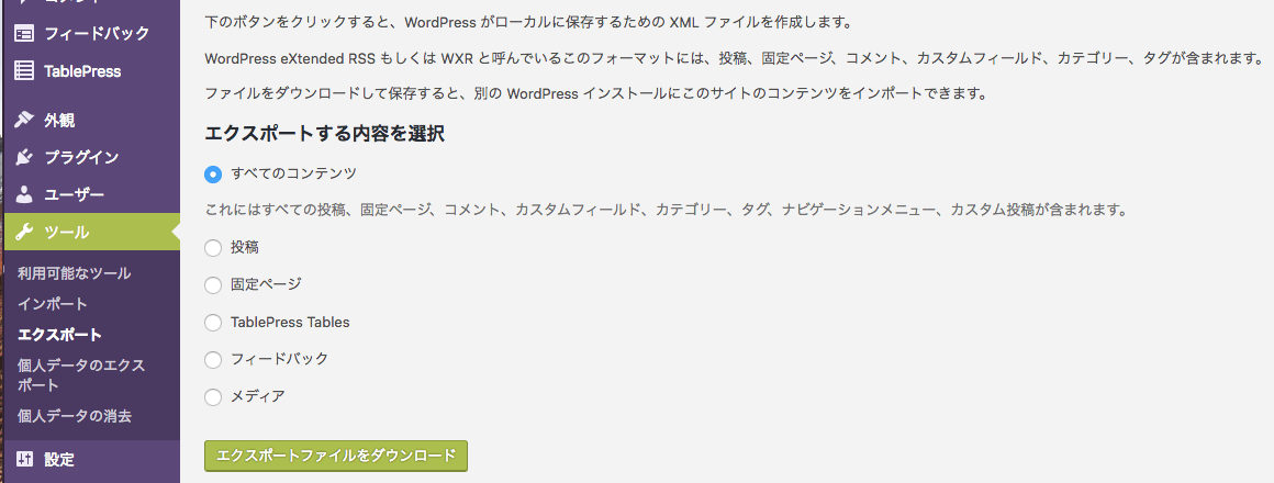 旧サイトのWP管理画面から「ツール」=> 「エクスポート」を選択。