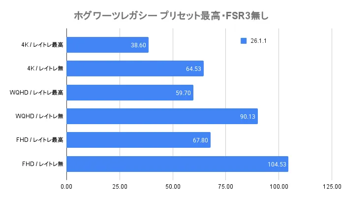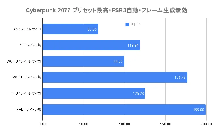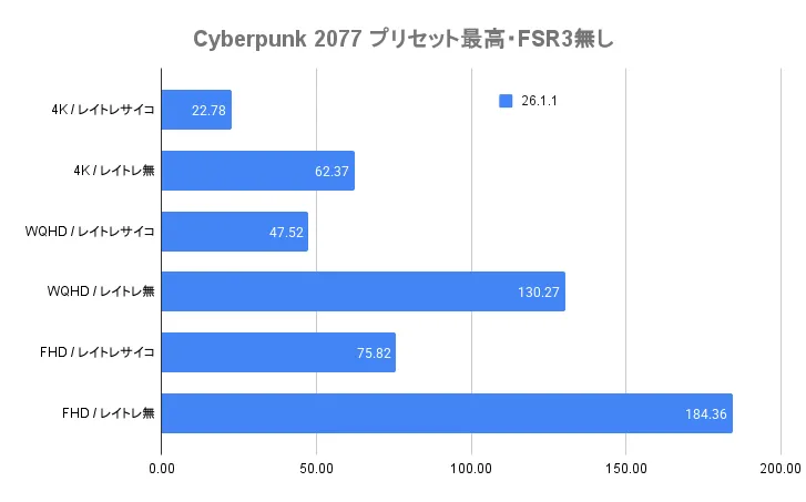まずは、FSR3 が無効の状態でレイトレ設定がサイコ・無効を比較したグラフがこちら。