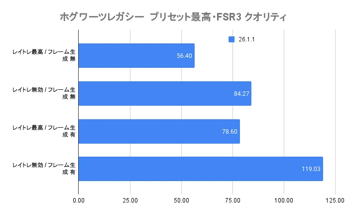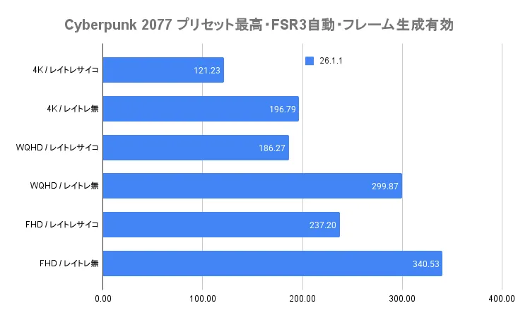 続いて、FSR3を有効化しレイトレの有効・無効とフレーム生成の有効・無効を比較したグラフがこちら。