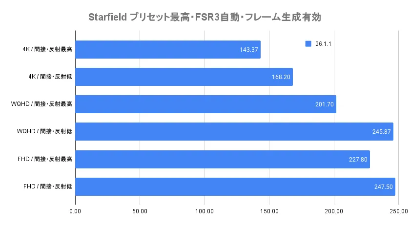 続けて、FSR3有効・フレーム生成を有効にした場合のグラフがこちら。