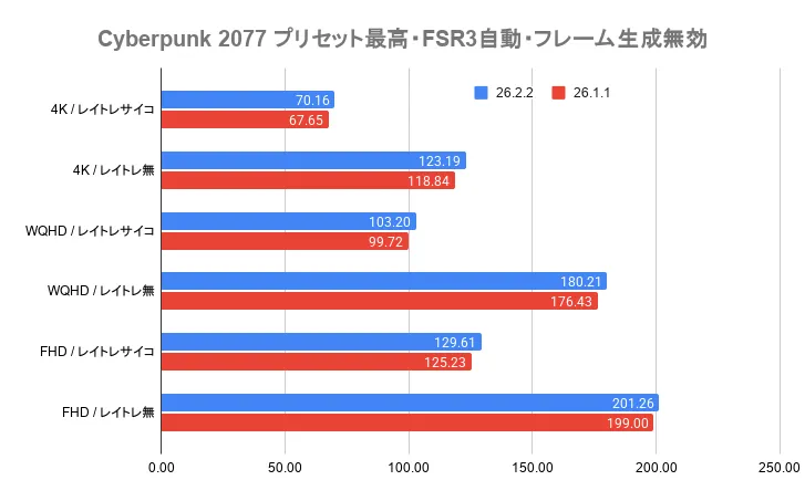まずは、FSR3 が無効の状態でレイトレ設定がサイコ・無効を比較したグラフがこちら。