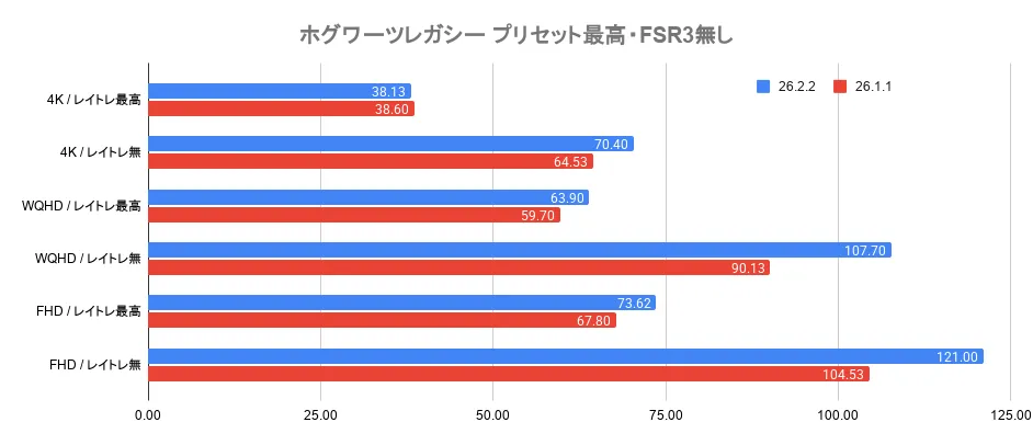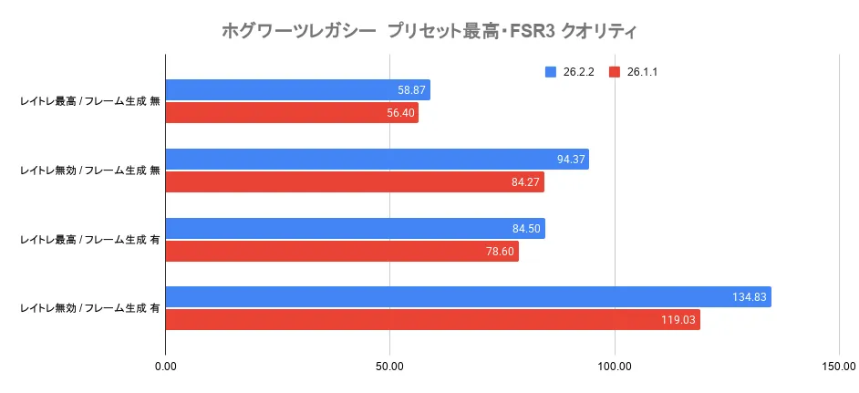 これらのグラフを見ると、v26.2.2では負荷が軽量な場合でFPSが伸びているように見えます。